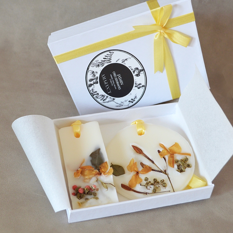 Cires parfumées façonnées en délicates tablettes, elles s’inspirent des grandes traditions de l’enfleurage. Le parfum, capturé au cœur de la cire, se diffuse subtilement pendant de longs mois. Parfaites pour parfumer armoires, tiroirs et petits espaces, les tablettes sont confectionnées à la main dans notre atelier, elles s'ornent de pétales, fleurs, bourgeons, grains odorants et feuilles.